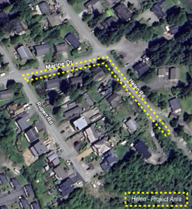 The Helen Road Area sanitary sewer project involves the replacement and upsizing of the existing gravity main along Marine Drive from Rupert Road to Helen Road and along Helen Road from Marine Drive to 1136 Helen Road. The alignment of the sewers run on the south side of Marine Drive and along the west side of Helen.