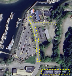 The existing lift station at Hemlock Road will be replaced with a new lift station on Waterfront Drive. This is due to capacity and condition issues. The replacement of the lift station involves replacement and upsizing of the existing gravity main on Hemlock Road from Waterfront Drive to Lyche Road and a new gravity main and force main on Waterfront Drive.
